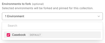 - Environments to fork (Optional): A "Casebook" environment will be selected by default. This is only required for the first forked API and the Casebook option may be unchecked for any additional forked APIs.
