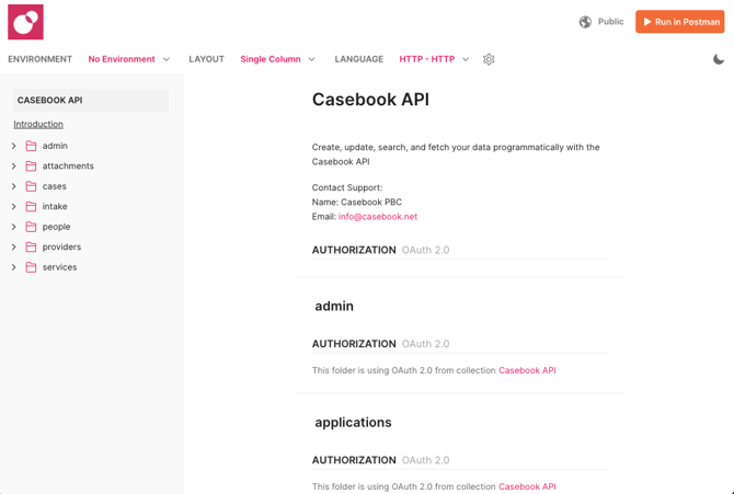 The simplest way to learn and test with Casebook APIs is to "Run in Postman" before integrating.