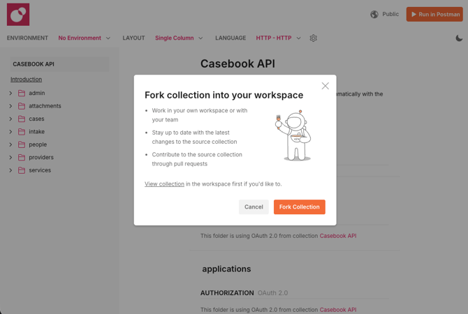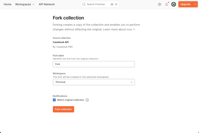 After clicking "Run in Postman", confirm that you would like to create a copy of the Casebook API in your Postman account by clicking "Fork Collection", then continue.