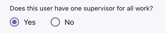 - If you're assigning only one supervisor to all roles, answer Yes. If the user has a supervisor for some and not all of their roles or if they have a different supervisor for each role, then select No.