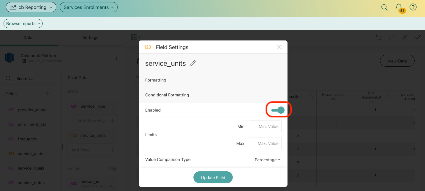 - From the Report Builder, select the field to open Field Settings (this must be a numeric field). The conditional formatting configuration is the last option in the settings (be sure to scroll down to view), and is disabled by default. Toggle to enable this setting.