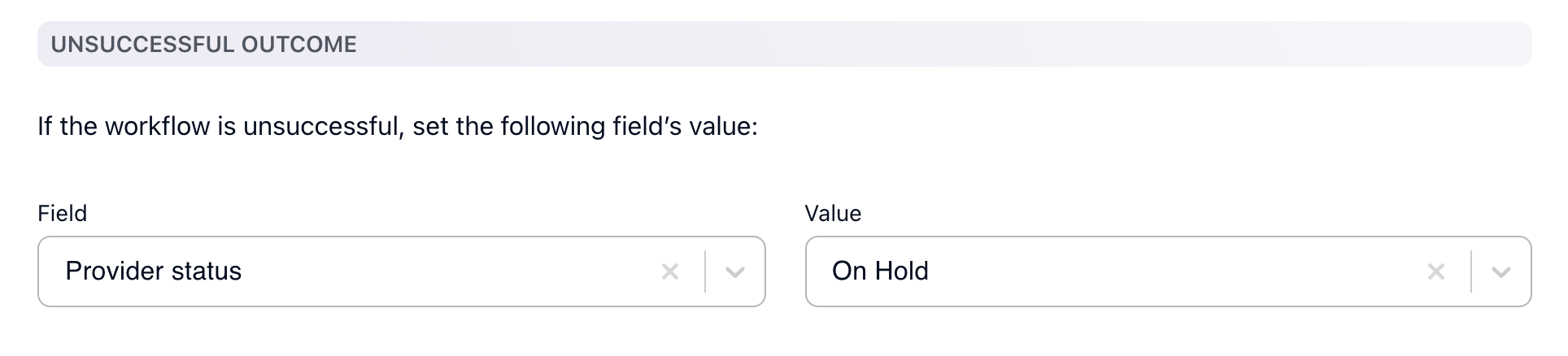 For example, if the outcome of the workflow is unsuccessful, the provider status moves to on hold.