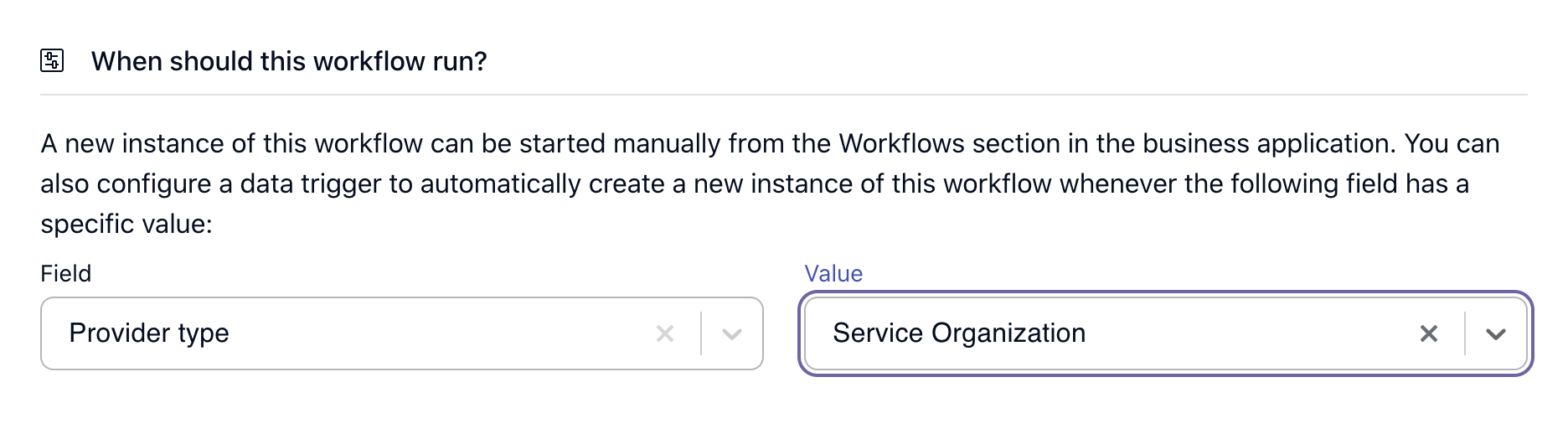 3. When should this workflow run? Select a trigger to run the workflow by choosing a data field (e.g. provider type, license status, etc.) and a value. The value depends on the field that's chosen.