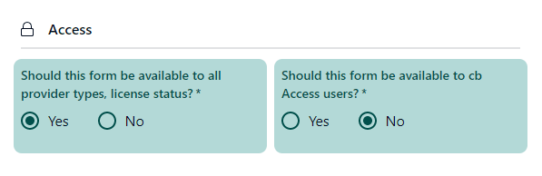 - Access: This is where you indicate if the form should be available to provider types, and license statuses.