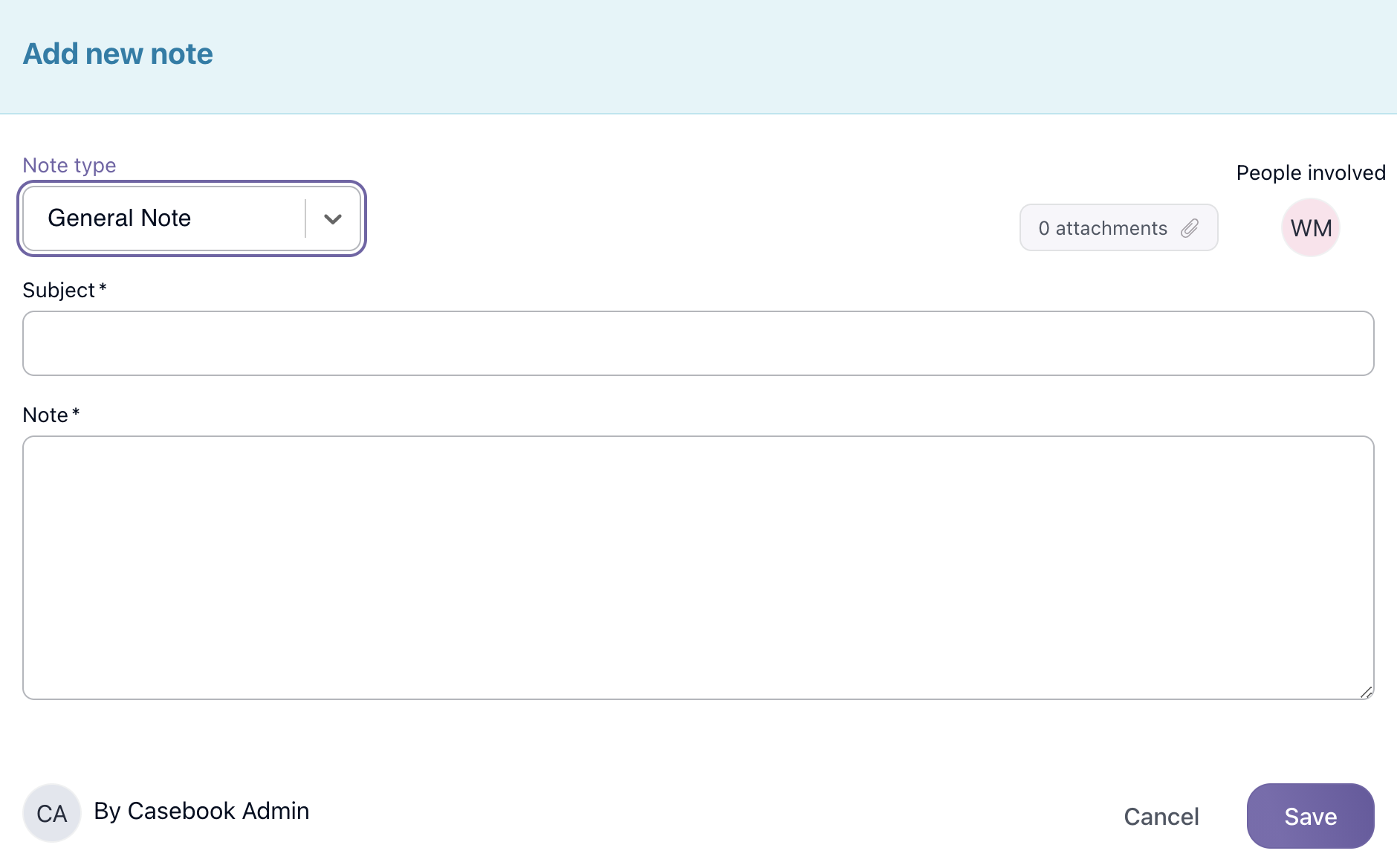 Adding a new note | Creating a note | Adding and Making Changes to People Involved | Adding Attachments to a Note | Editing or Deleting a Note | Viewing a Note | Notebook Page | Note Locking | Group or Bulk Service Notes