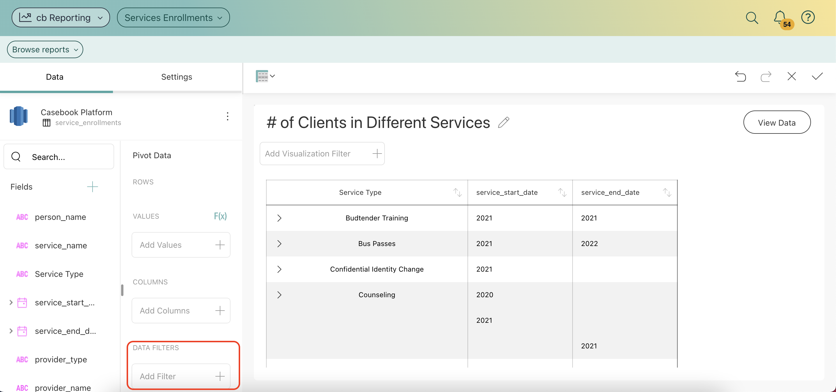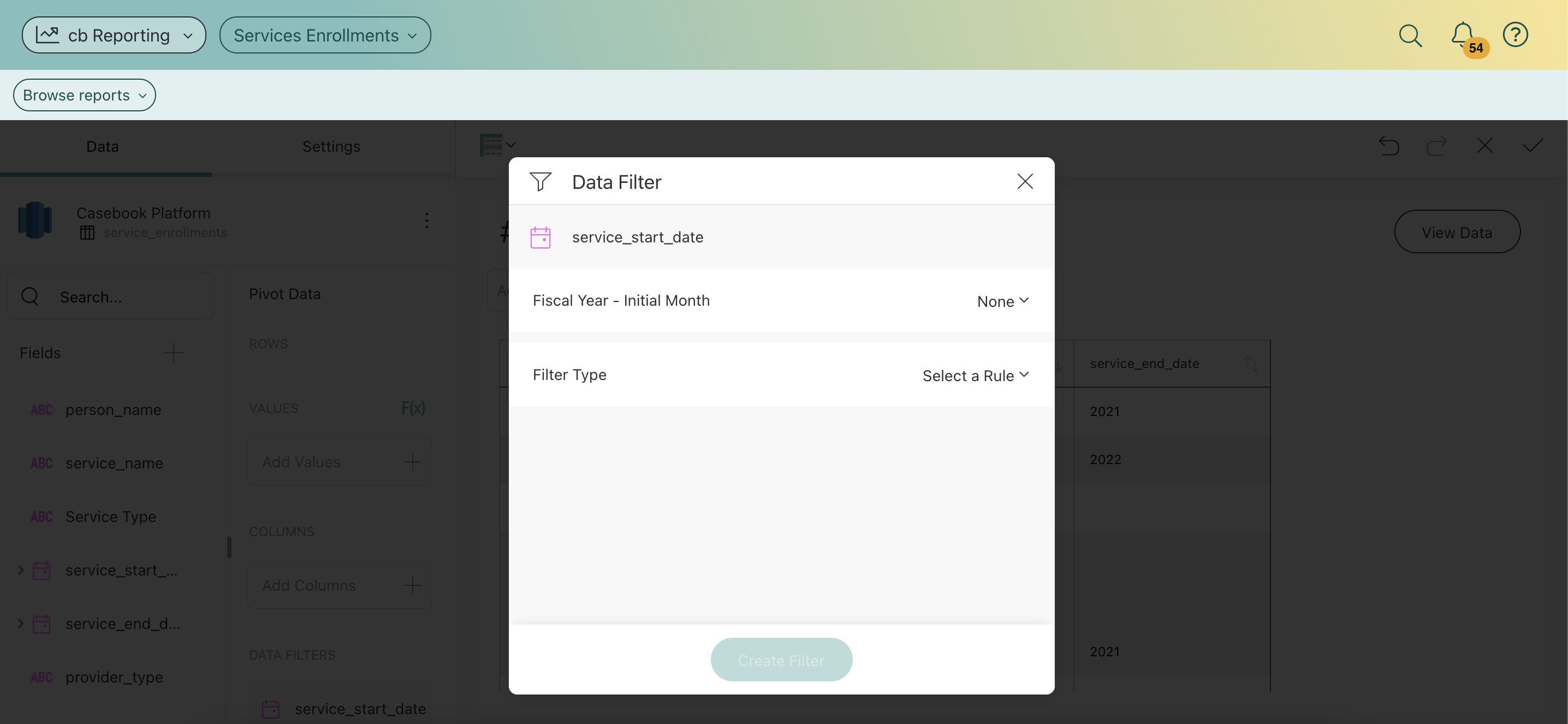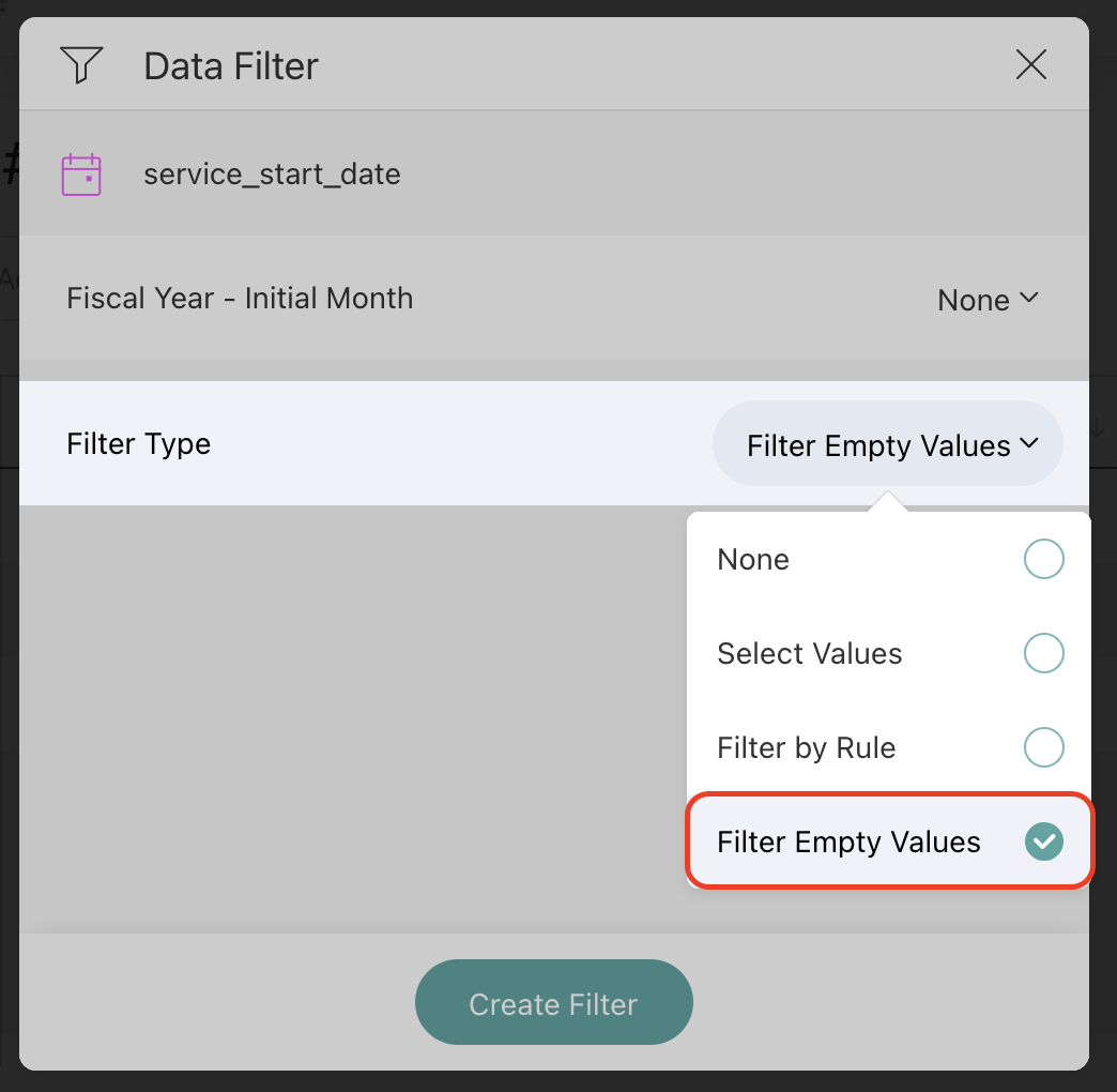 - Drag and drop the field that you wish to use to filter the report into this section. This will prompt a modal to pop up.