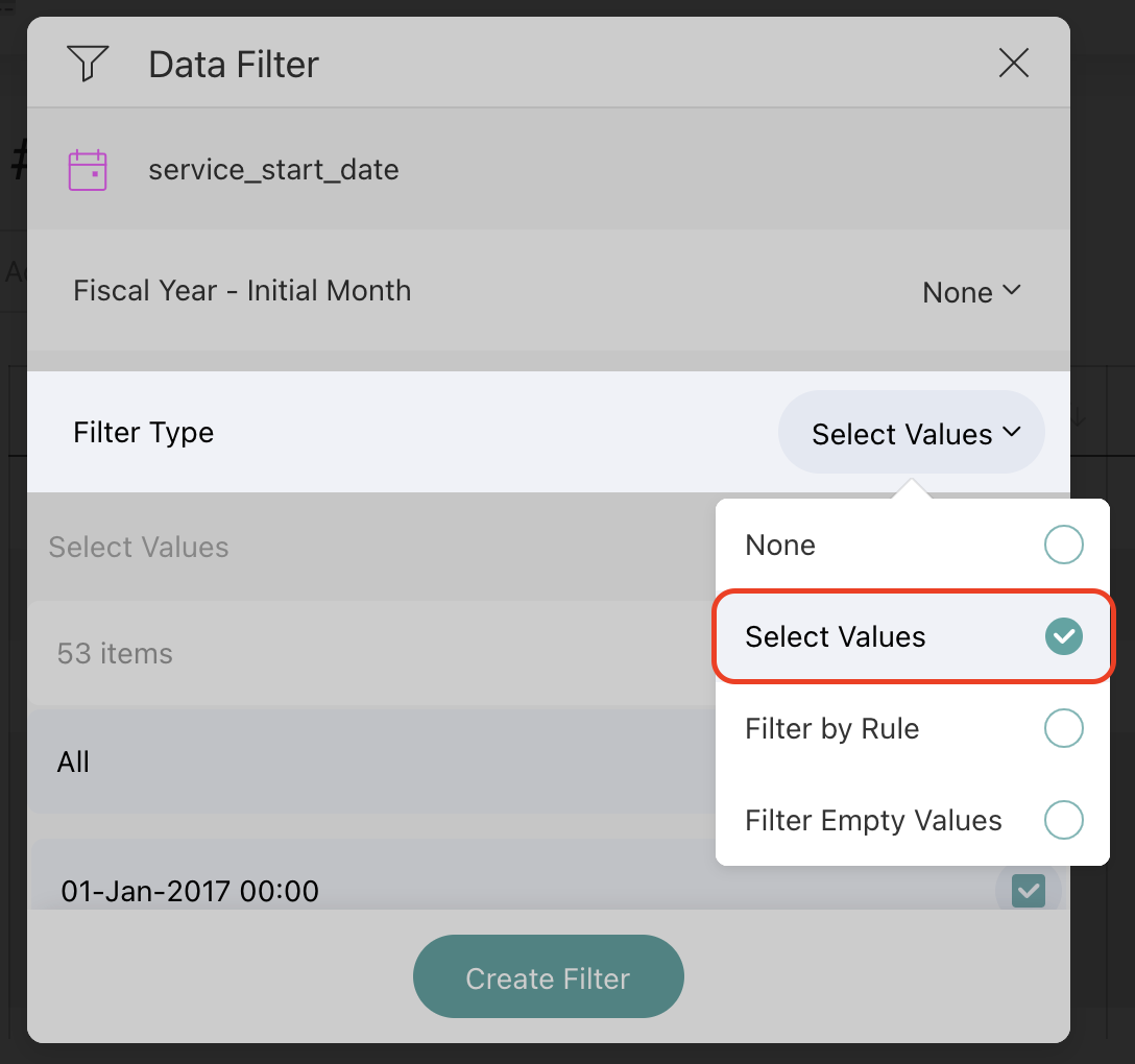 This displays the list of possible values for a column and allows you to select only the items you want to remain in the dataset. Rows with values excluded by the filter aren't displayed in the visualization.