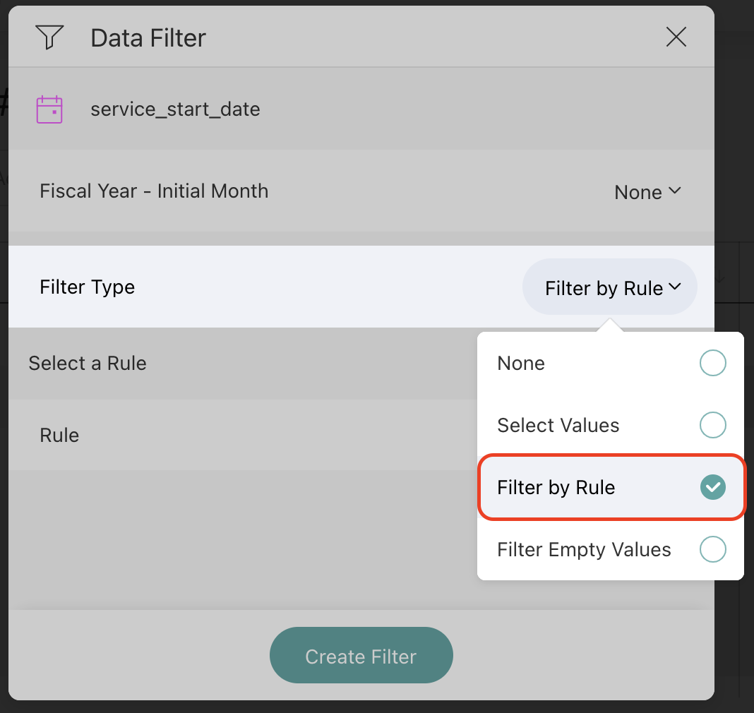 The Filter by Rule option enables the definition of more complex rules. The available rule options change depending on the field type.