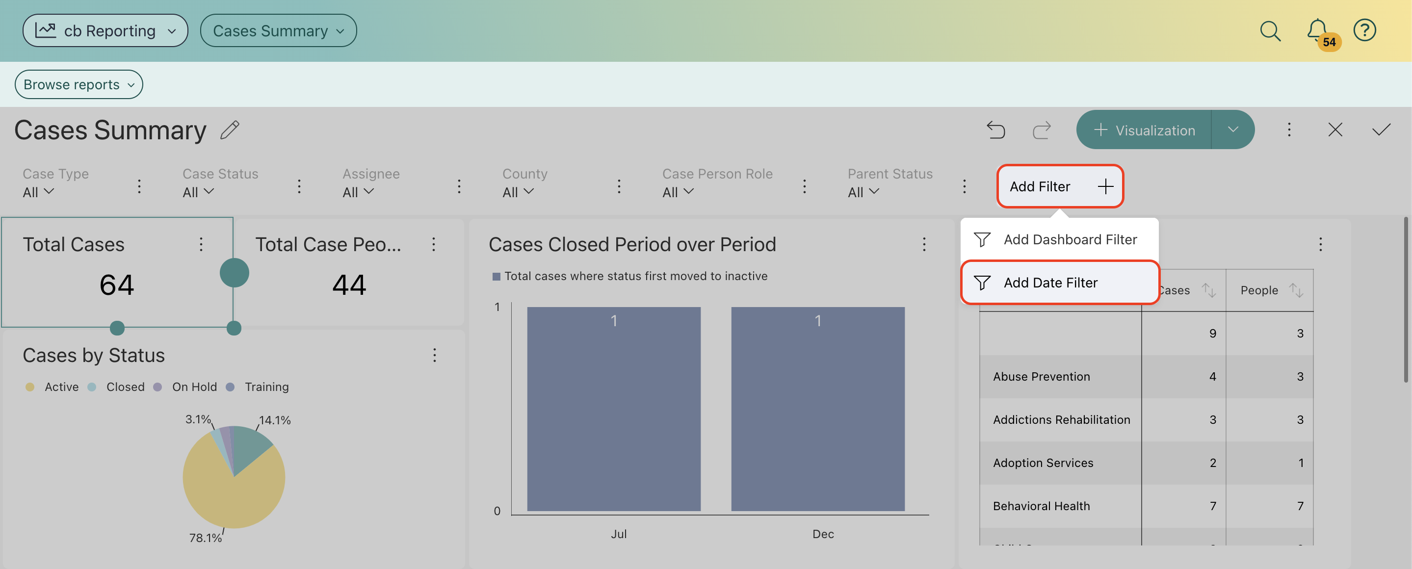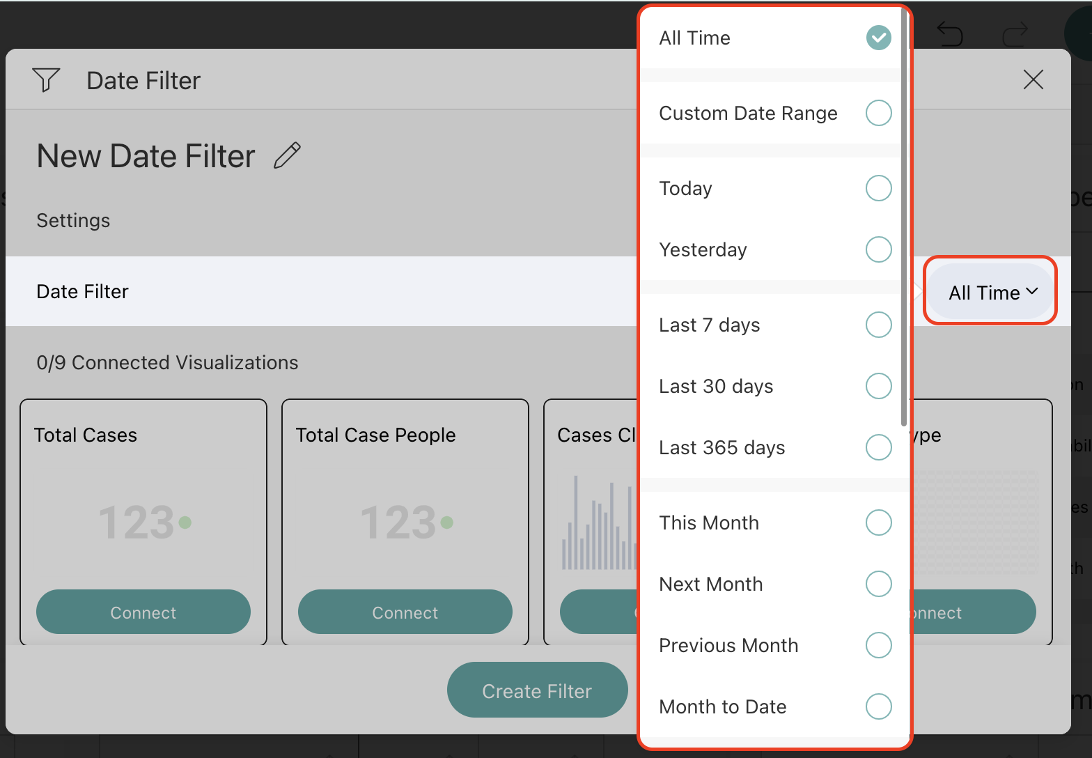 cb Reporting supports enabling a range of dates as dashboard filters to bind your data too.