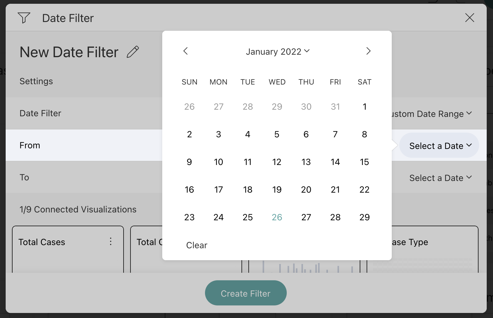 cb Reporting offers a variety of pre-set date ranges (including the last 30, 7, or 365 days, among others), but you might want to define your range to see data within a specific date range. Selecting the Custom Date Range in the Date Filter dropdown to see a calendar with personalized day, month, and age options.