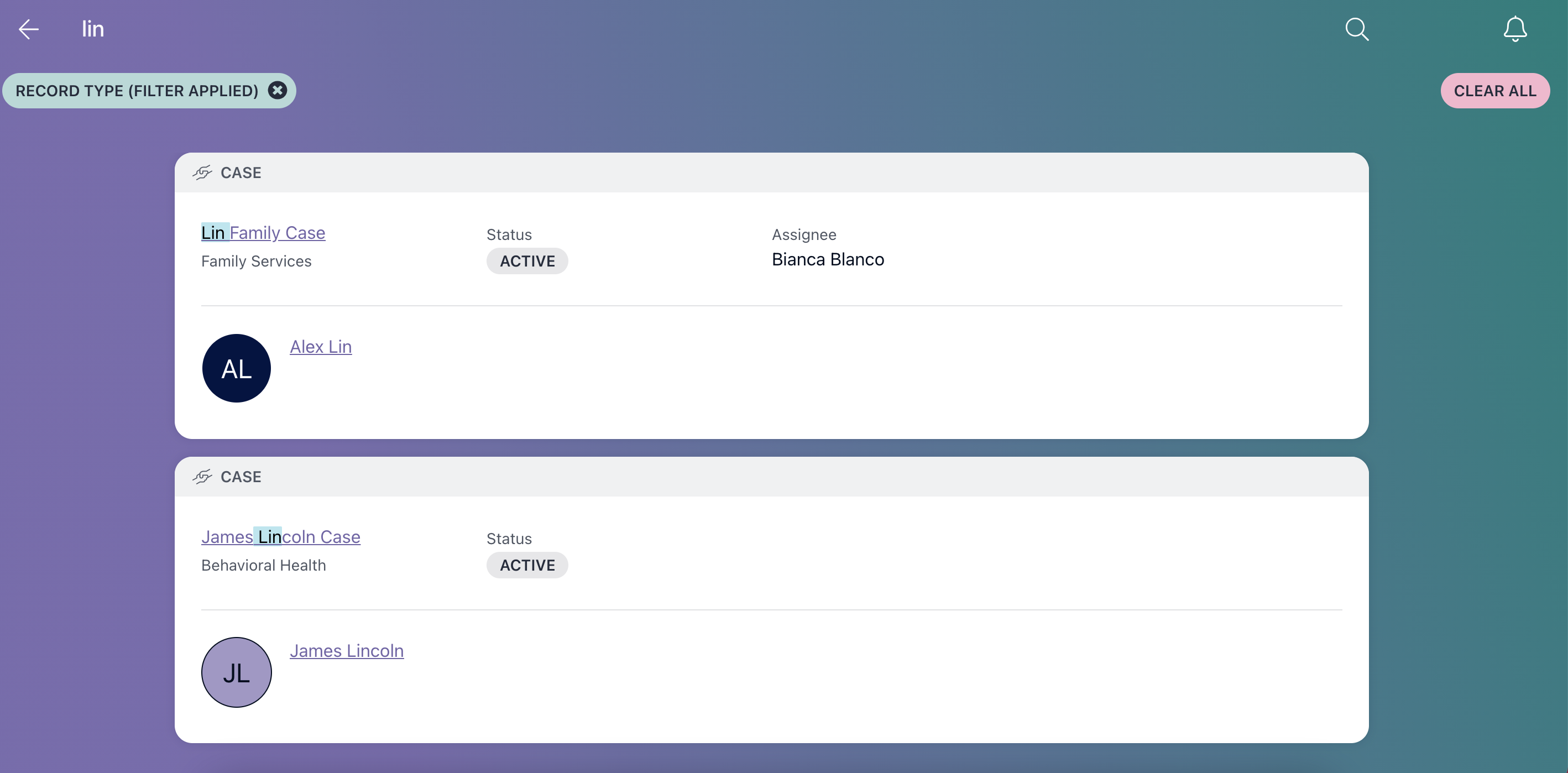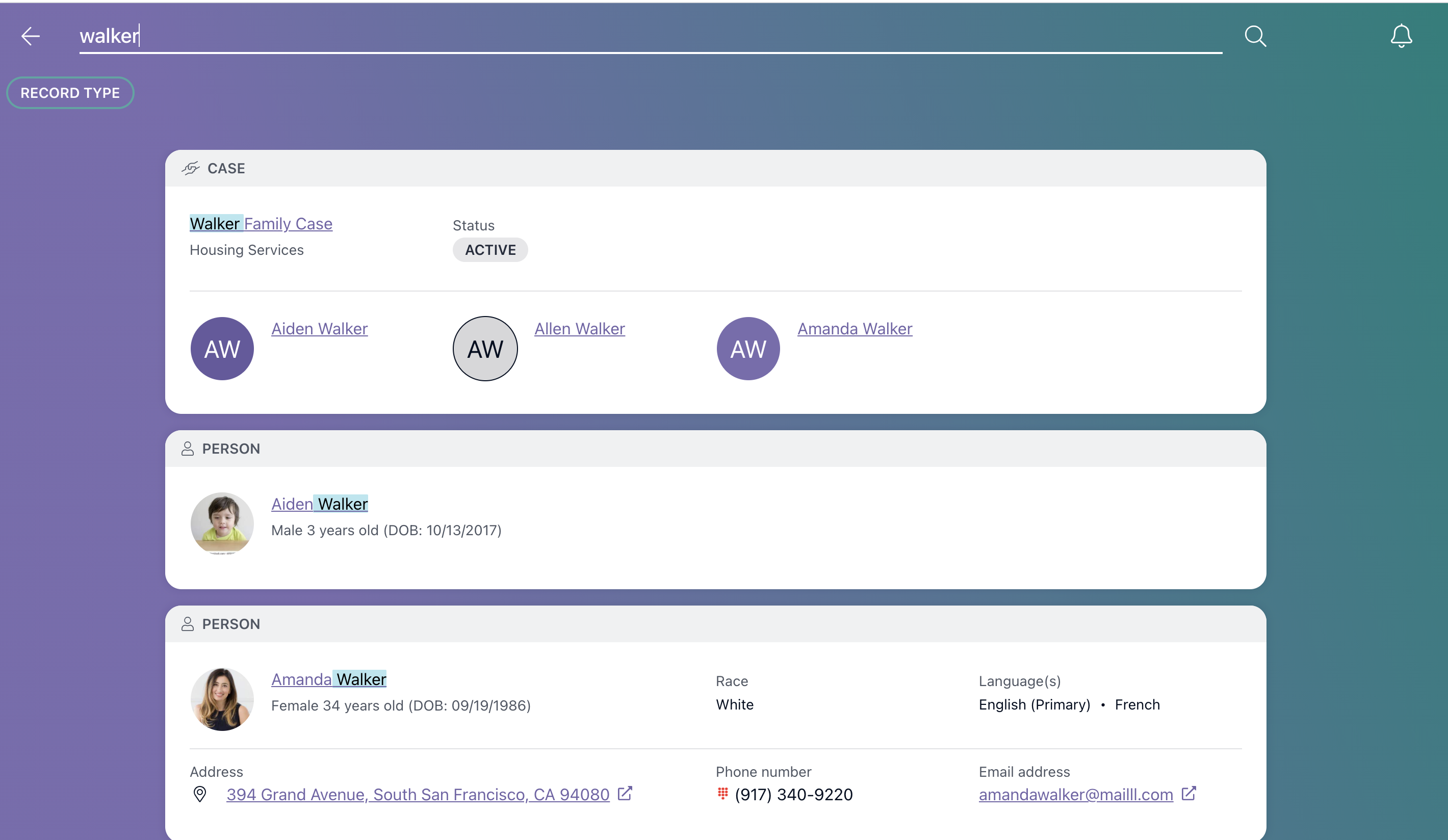 Your search results will appear as a list of cards. Each card will be associated with a case, person profile, intake, or provider.