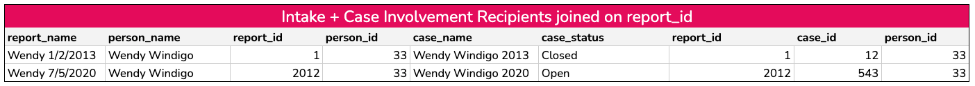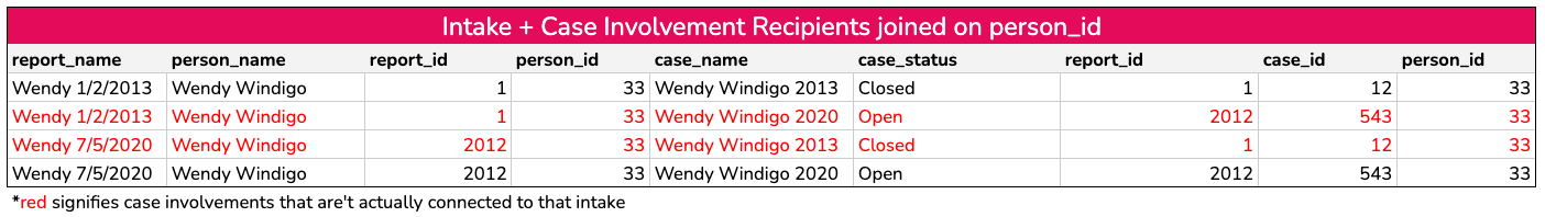 If you join on the person_id, your rows will split, so every intake report will be tied to all the cases where that person is listed - this will give you a table of incorrect information.