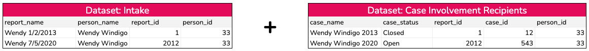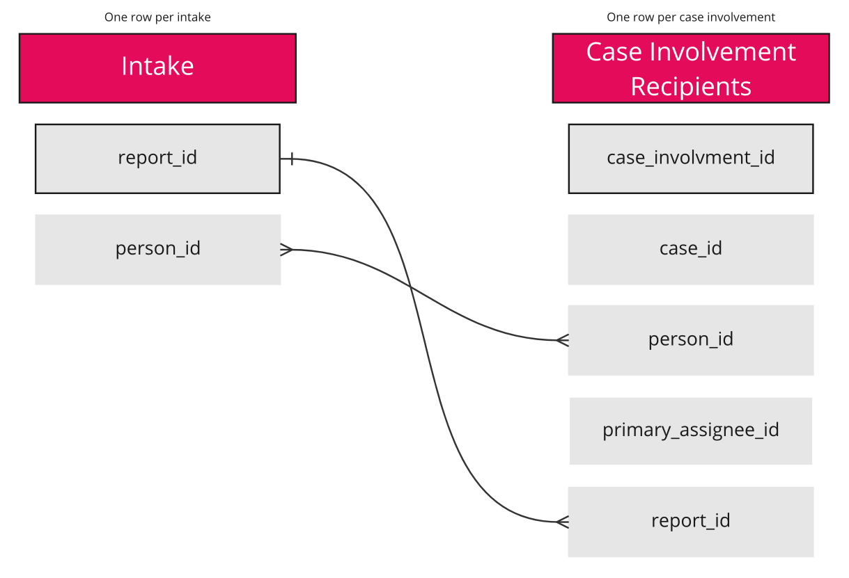 This is the second hardest decision after you’ve identified which datasets you need and is the cause of most issues when it comes to joining datasets. The question you should try and ask yourself is, what are the bigger pieces of work I’m trying to join together? In this example, you want to know about intakes in relation to cases involvements. So, while you do have person_id and report_id in common between the datasets, you're focused on learning about which involvements are tied to which intakes.