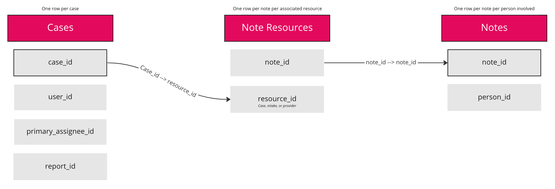 Join in the note_resources table using the case_id from cases and join it to the resource_id in the note_resources table. This table has a list of all the notes and what units of work they’re associated with.