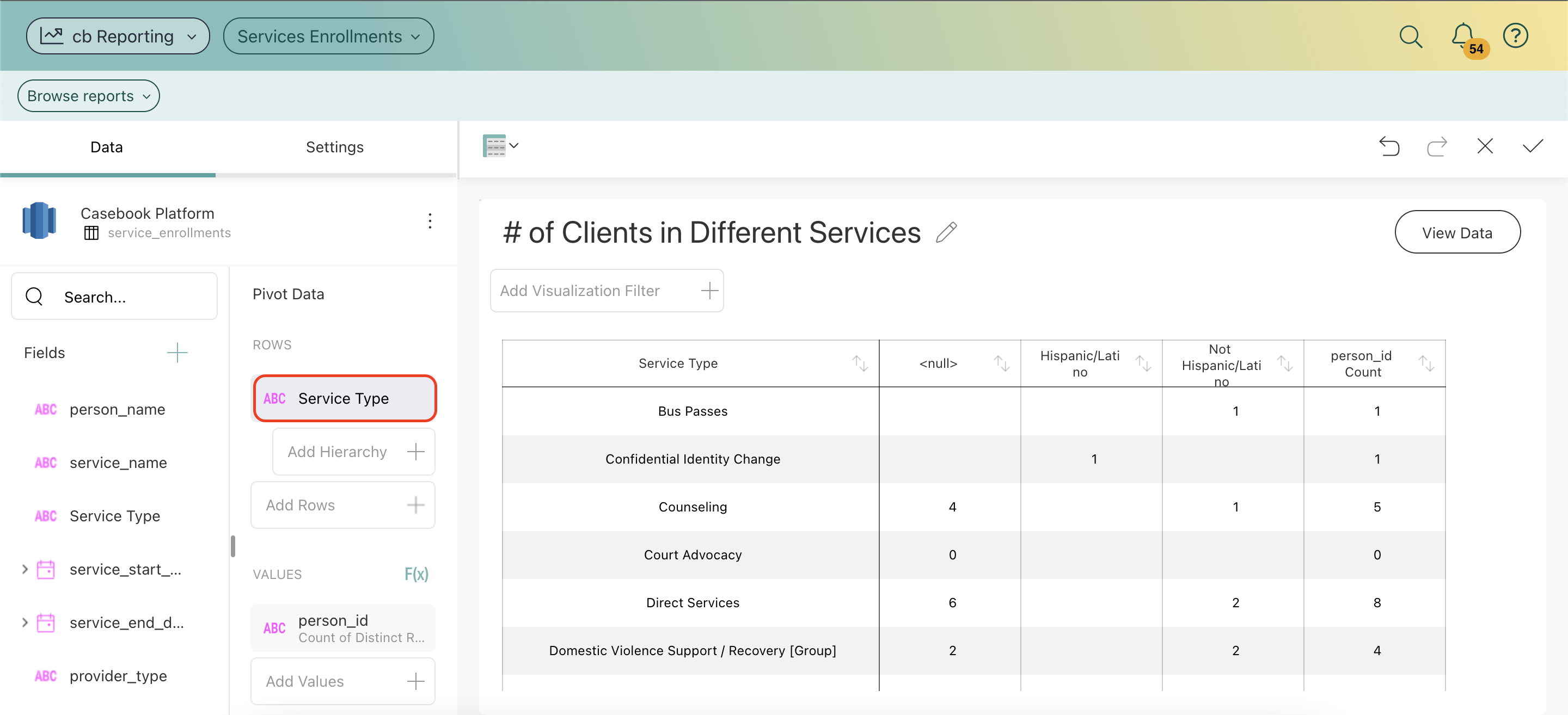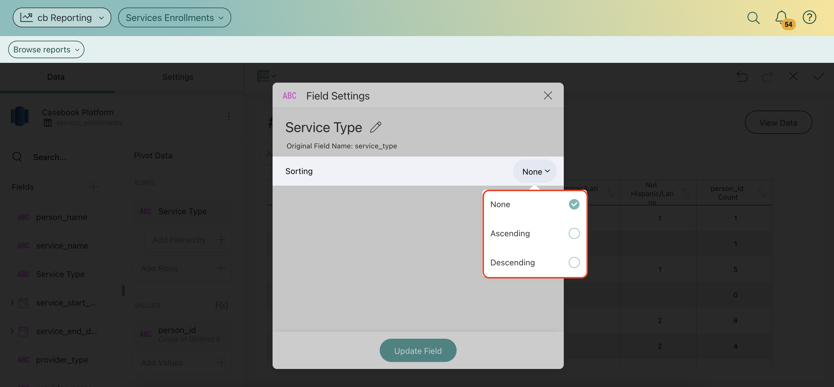 Sort by Field cb Reporting allows you to change how the data in a visualization is displayed by sorting the data in ascending or descending order. Enabling Sort by Field The Sort by field option is part of the fields settings, but is hidden by default. To enable it, follow the steps below: Select the Field from the Pivot Data column to open the Field Settings. In Field Settings, choose Ascending or Descending for Sorting.